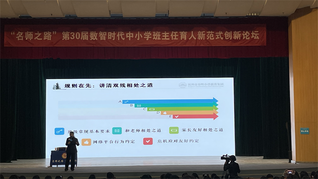 当日下午,全国知名班主任、杭州市春晖小学教育集团书记田冰冰带来《家校共育“稳”者胜》主题分享。作为正高级教师、浙江省春蚕奖及全国十佳小学班主任获得者,田老师围绕家校协作的“问题意识”与“解题能力”展开交流,梳理课堂教学、班级管理、家校沟通中的常见问题,提出“厘清秩序、规范步骤、润泽关系、更新思维、推动跟进”的协作路径,强调以“稳”为核心把握分寸、情感与节奏,助力教师构建和谐共进的教育共同体。
