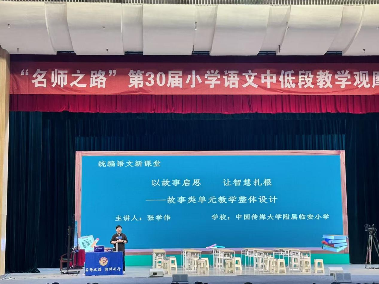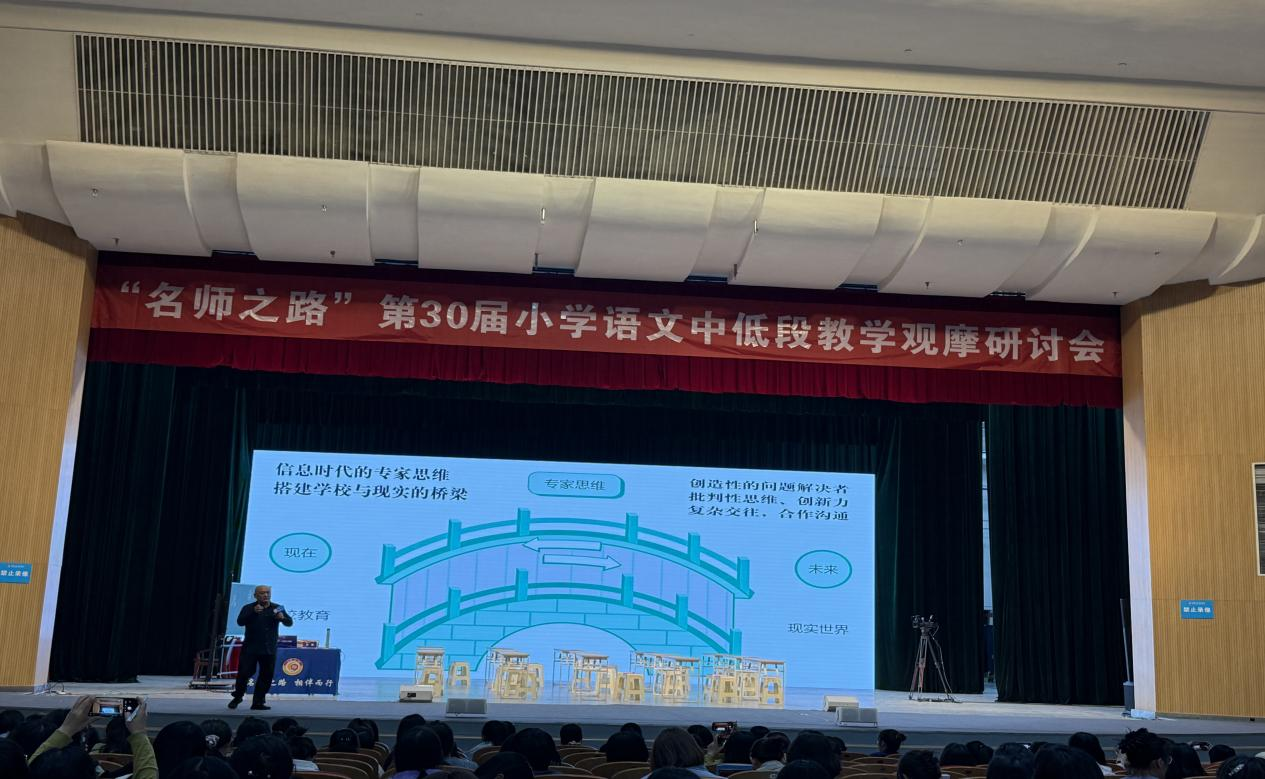 3月27日上午,我校语文教师马舒云、安惠中率先参与研讨活动。温州市第二实验小学校长、国家“万人计划”名师林乐珍老师先执教示范课《古对今》,以对韵诵读为载体,将识字、积累与文化浸润融于一体,课堂趣味盎然;随后她带来《语言文字梳理活动与设计》专题讲座,系统讲解梳理类学习活动的设计思路与实施策略,为语言积累与运用教学提供专业指引。江苏师范大学硕士生导师张学伟老师展示《大象的耳朵》一课,以故事为引、以朗读为桥,引导学生在情境思辨中读懂文本;其讲座《以故事启思,让智慧扎根》围绕“语思融合”,深入阐述故事教学的育人价值,助力培养学生的阅读理解与逻辑表达能力。